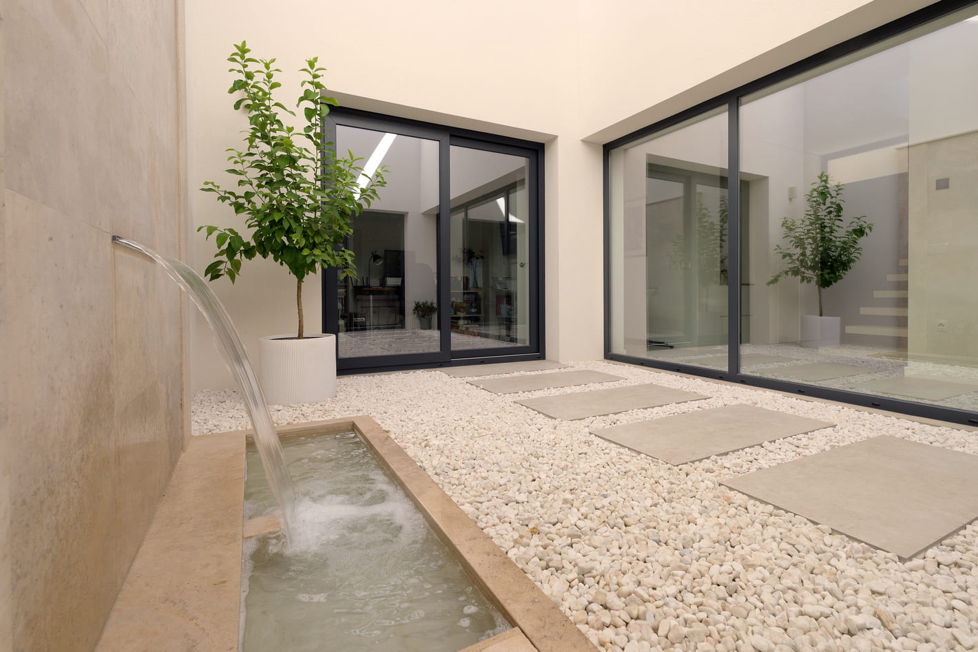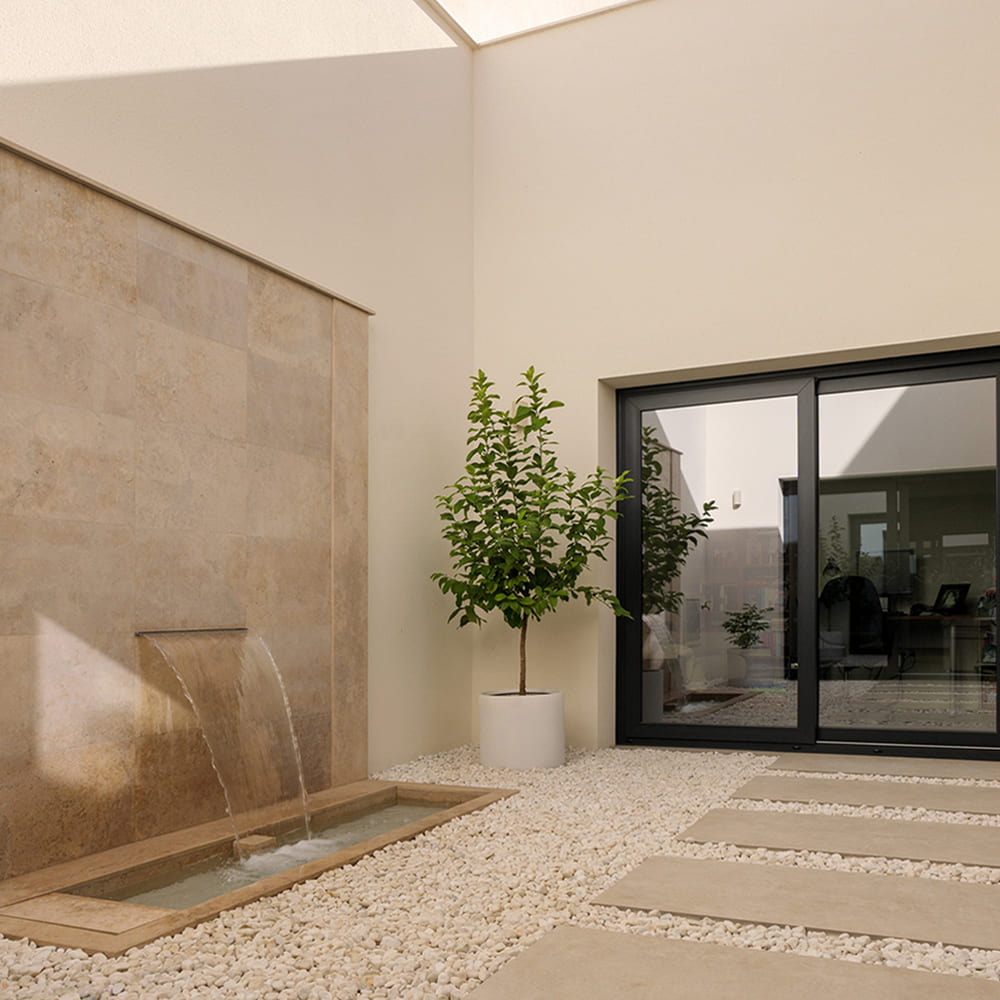 El proyecto se plantea a partir de una vivienda organizada en torno a un patio protagonista, que articula los espacios interiores y define la relación entre estancias. Los huecos se diseñan de forma estratégica, respondiendo a las distintas necesidades de cada espacio y generando una conexión constante entre interior y exterior. La presencia del agua en el patio aporta dinamismo, frescura y una sensación continua de bienestar en toda la vivienda.