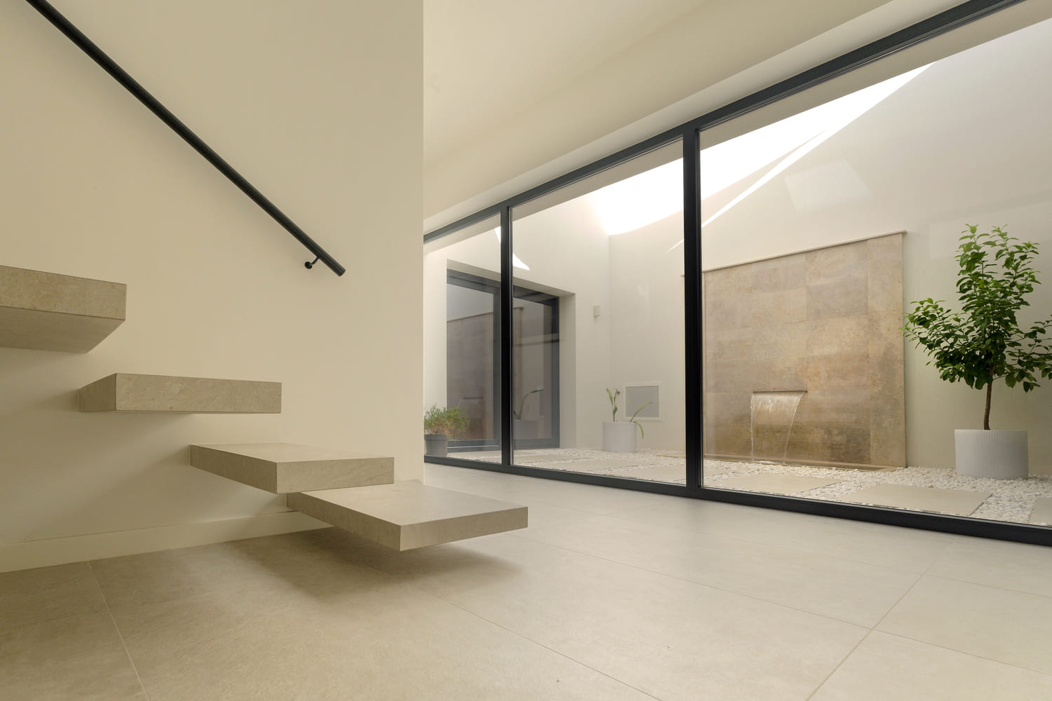 El diseño limpio, las líneas sencillas y la paleta de tonos beige claros refuerzan la sensación de calma y equilibrio, dando lugar a una vivienda atemporal, luminosa y funcional. La entrada a la casa se convierte en una experiencia arquitectónica, donde el patio actúa como elemento sorpresa y eje vertebrador del proyecto, aportando identidad y carácter propio a la vivienda.