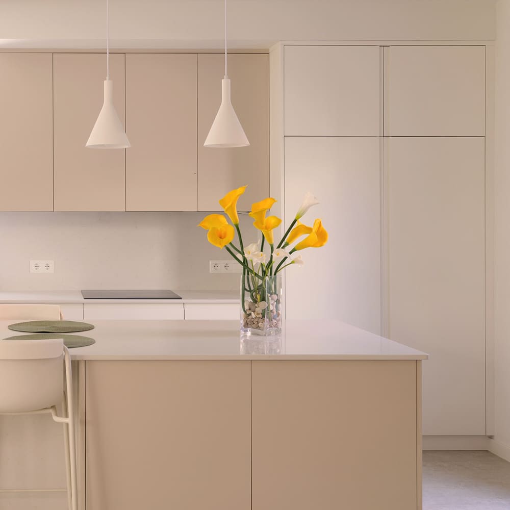La cocina se concibe como un espacio abierto y conectado visualmente con el patio, acompañando al espacio principal sin restarle protagonismo, integrándose de forma natural en el conjunto de la vivienda.